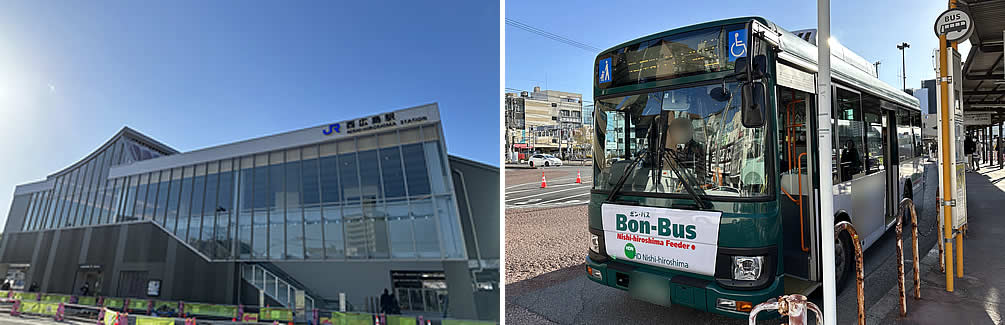 広島の主要駅「西広島駅」からバスで15分。ジ・アウトレット広島行きだから、本数も多くて便利。
